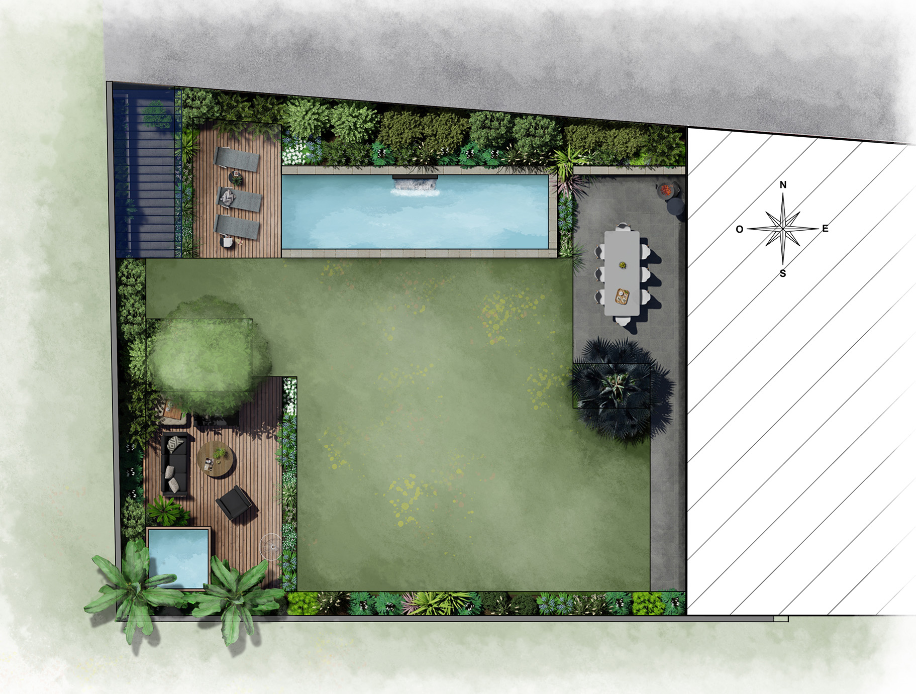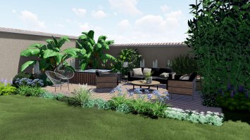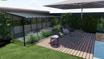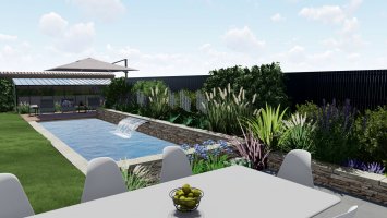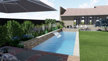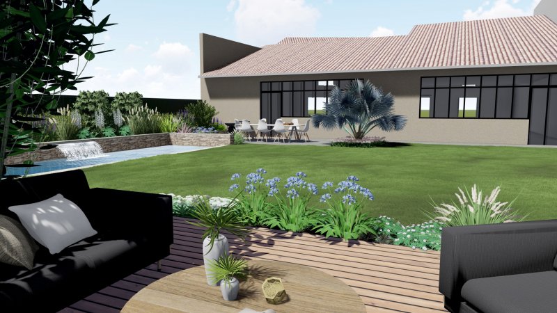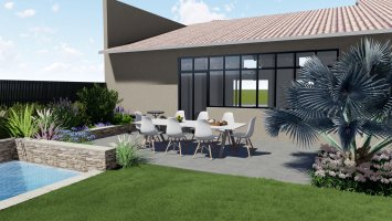 Travaux effectués: Piscine – SPA – Maçonneries diverses – Dallage en pierre – Terrasse bois – Verrière –Espaces verts – Mobilier.